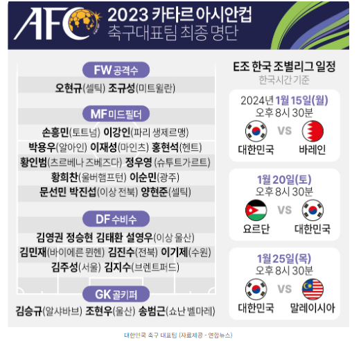 - 목 차 - 1. 2024년 카타르 아시안컵 조편성 2. 아시안컵 대한민국 축구대표팀 경기일정 3. 아시안컵 대한민국 축구대표팀 선수명단 4. 중계방송 안내 |