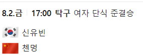 신유빈 선수는 8월 2일 오후 5시에 여자 단식 준결승전을 첸멍 (4위·중국) 선수와 한판 대결을 합니다. 신유빈 선수가 8강에서 승리한 기세로 4강에서 승리하고, 또한 결승 가서 금메달을 획득하여 목에 걸고 환호하는 모습을 기대해 봅니다.