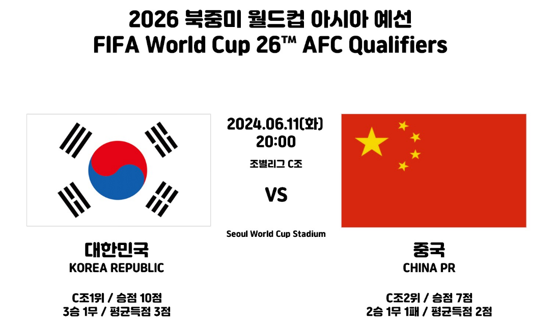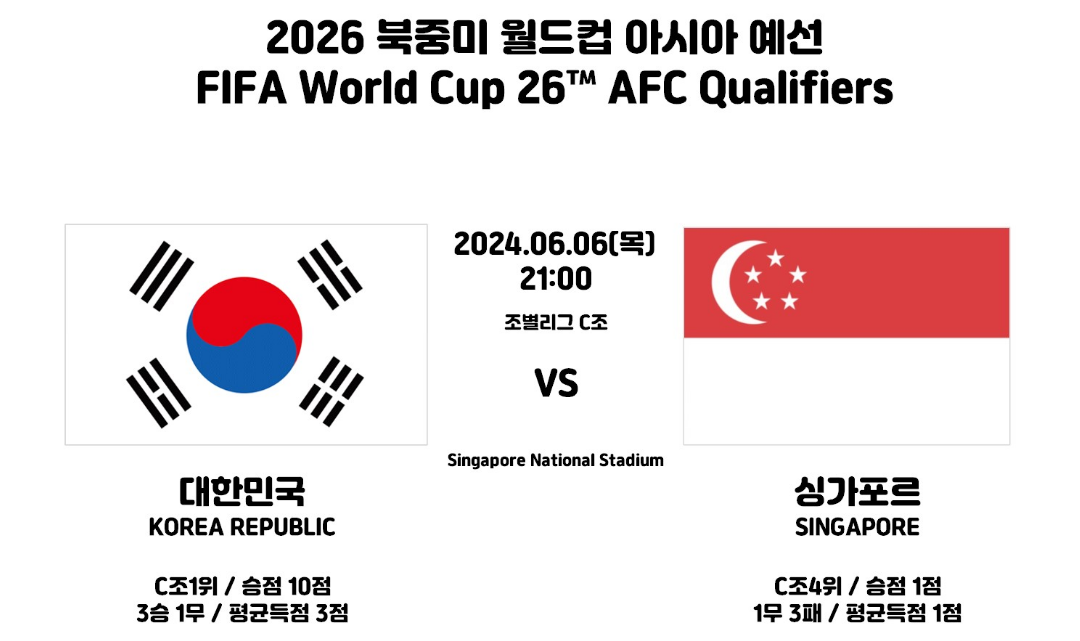 2026 북중미 월드컵 아시아 2차 예선에서 대한민국은 C조 1위를 유지하고 있는 가운데 예선 통과를 위해 앞으로 있을 싱가포르, 중국과의 중요한 경기를 앞두고 있습니다. 이번 경기를 통해 대한민국 대표팀의 멋진 경기와 함께 전승을 기대하면서 함께 응원했으면 합니다. 대한민국 파이팅입니다.